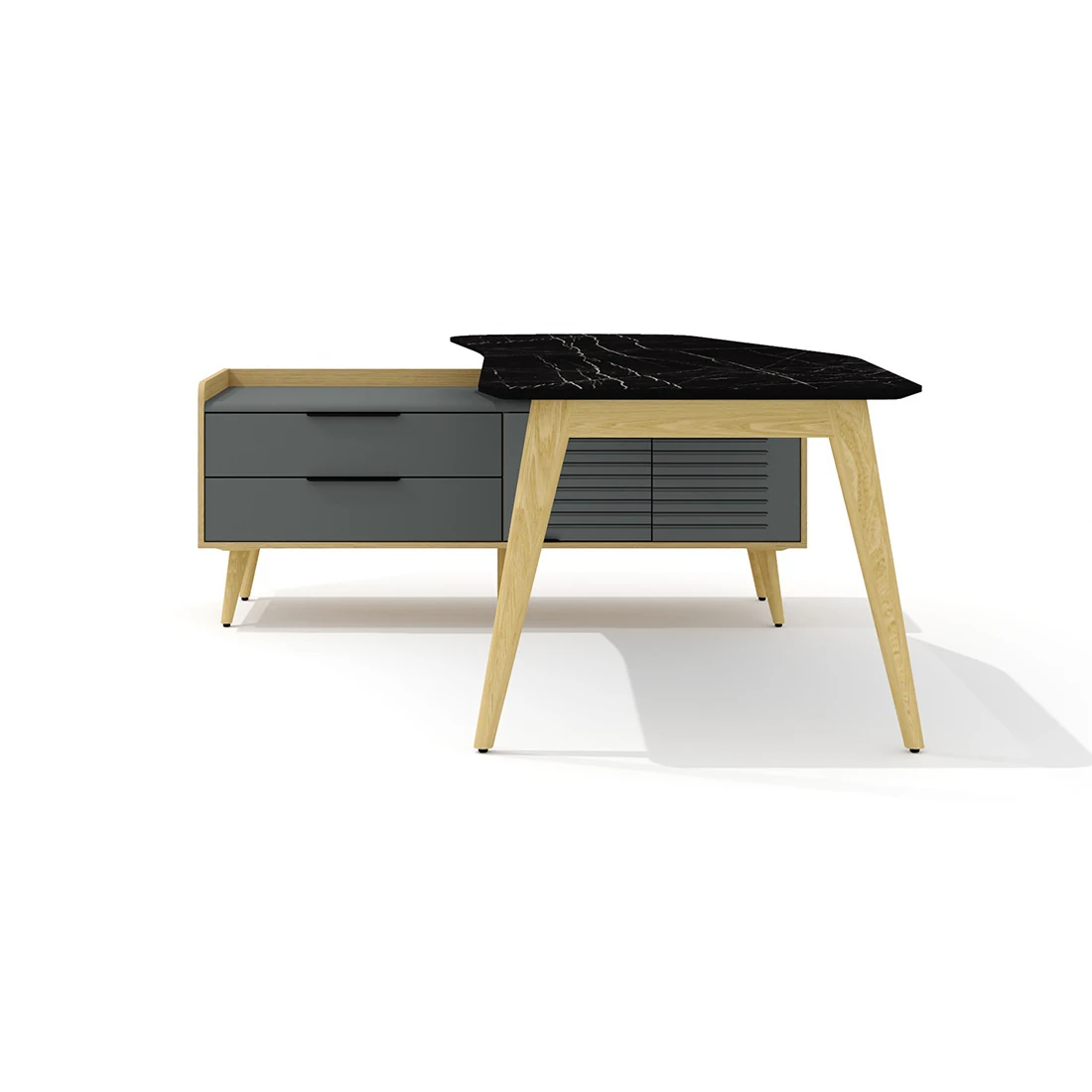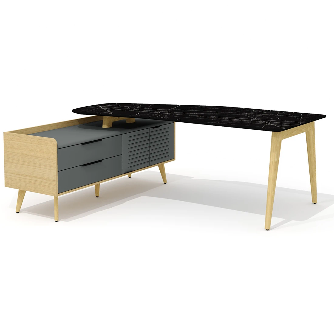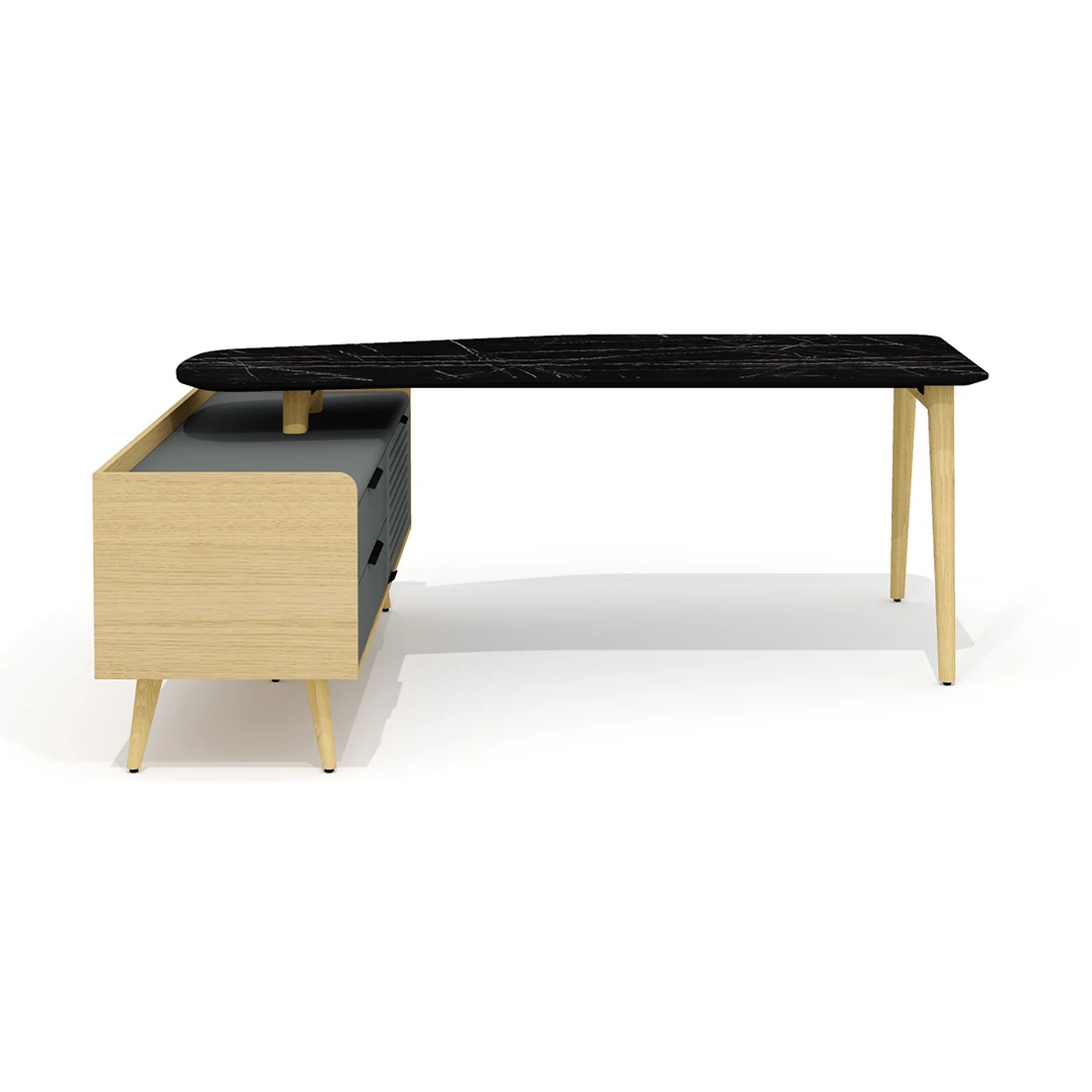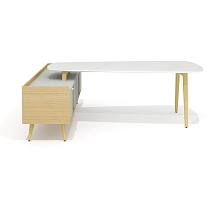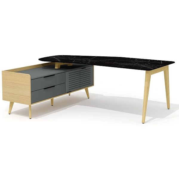 Столешница стола – фигурная, имеет эргономичную форму с плавными переходами по периметру и условно состоит из правой прямой части и повернутой суженной левой. Углы правой части плавные и имеют радиус скругления 80 мм, левой – плавные, со скруглением радиусом 150 мм. Левый торец столешницы выполнен в форме дуги радиусом 1000 мм. Левая часть столешницы повернута относительно правой по внешней кромке под углом 20 гр. Глубина столешницы в правой части – 900 мм, левой (в самом узком месте) – 688 мм. Торцевые части столешницы обработаны по технологии обратного фрезерования (скос) с эмалевым покрытием черного цвета. Толщина внешнего края скошенной столешницы – 10 мм. Обработка столешницы выполнена исключительно механическим способом на высокоточном оборудовании. Категорически не допускаются ручная обработка материала, наличие неровностей, сколов, царапин и прочих повреждений материала.
