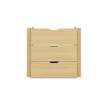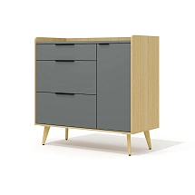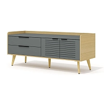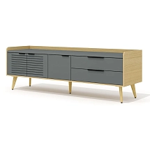 Топ и фасады тумбы выполнены из плиты МДФ и облицованы вакуумным методом прессования высокопрочной ПВХ-пленкой цвета «графит» в тиснении «шагрень». Остальные детали (включая боковые и задние стенки выдвижных ящиков) выполнены из древесно-стружечной плиты, облицованной пленкой цвета «дуб Сорано» на основе термореактивных полимеров (ГОСТ 32289-2013) в тиснении «шагрень». Топ тумбы имеет толщину 25 мм, остальные детали – 16 мм. Опоры тумбы выполнены из массива ясеня и покрыты прозрачным лаком. Днища выдвижных ящиков – окрашенное ДВП цвета «беж» толщиной 3 мм.