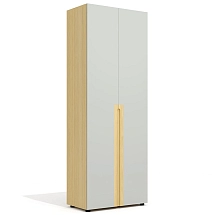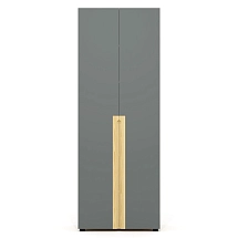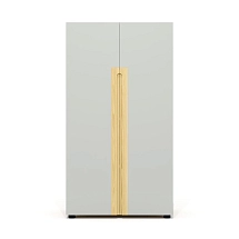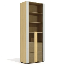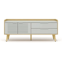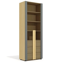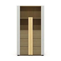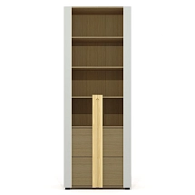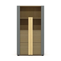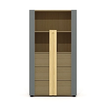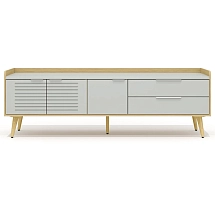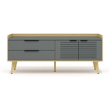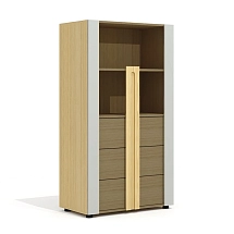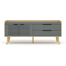 Внутреннее пространство тумбы разделено перегородкой на две части. Левая часть тумбы оснащена двумя широкими выдвижными ящиками, установленными на скрытые шариковые направляющие. Правая часть тумбы выполнена в виде вместительной ниши шириной 764 мм и закрыта двумя распашными фасадами высотой 334 мм, установленными на регулируемые петли. Метод крепления петель к корпусу тумбы – евровинты. Распашные фасады и выдвижные ящики тумбы оснащены механизмами плавного закрывания. Лицевая фурнитура — металлические ручки-профили эргономичной формы, цвет «черный матовый». Широкие ящики тумбы оснащены ручками длиной 296 мм (межцентровое расстояние 224 мм), распашные фасады – ручками длиной 146 мм (межцентровое расстояние 96 мм). На лицевой стороне распашных фасадов широкой ниши размещен симметричный рисунок из девяти горизонтальных линий-углублений.